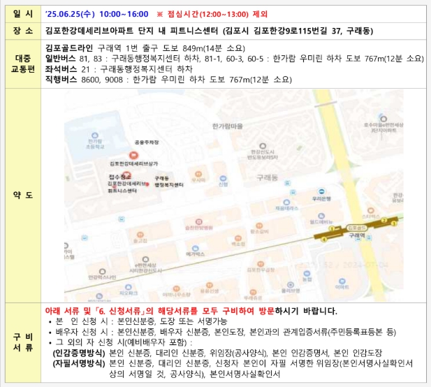 ※ 만 65세 이상 고령자 및 장애인 정보제공자만 현장 접수 가능 - 현장 접수 장소: 김포한강더세리브아파트 내 피트니스센터